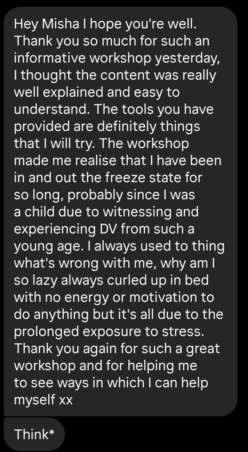 As a Mental Wellbeing Practitioner and Somatic Trauma-Informed Coach I have supported hundreds of women to go from surviving to thriving.